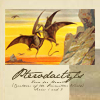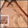 Description: sketch of dinosaur bones, with picks and b&w photo, presumably of early archeologists